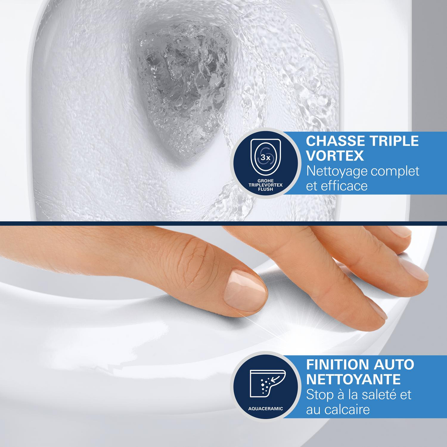 - GROHE Power flush : cuvette sans bride associée à la technologie de rinçage GROHE triple Vortex